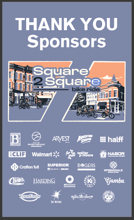 Your Square 2 Square Bike Ride hosts, Bentonville Parks & Recreation and Fayetteville Parks & Recreation, would like to thank our collaborative partners who help to make this event possible. We appreciate all the businesses and organizations that have contributed.